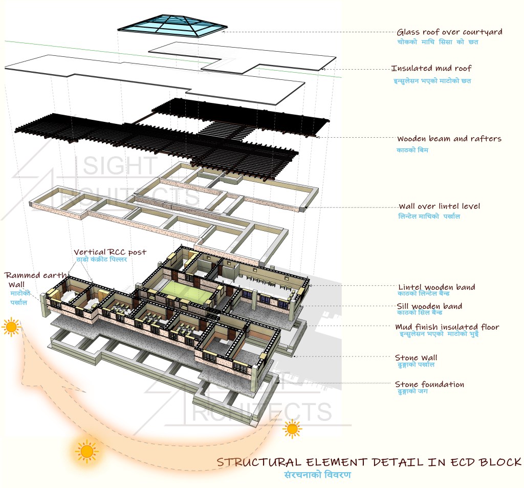 The campus design is based on vernacular architecture of Dho Tarap valley and optimized for optimum use of local building materials and building expertise, with careful modifications– to facilitate easy transfer of technology to the local community— for effective passive solar heating and insulation, and floor structure based on needs of campus users and standard design principles for early childhood centers.